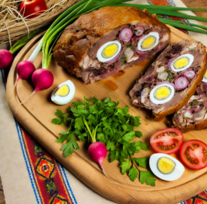 Drob is a traditional Easter dish, essential for the festive table. It is made from lamb offal (liver, kidneys, heart), mixed with fresh herbs, onion, garlic, eggs and spices. These are wrapped in lamb bladder or plastic foil, then baked in the oven to obtain a tasty and tender dish. Drob is served cold, alongside mustard or a spring salad. - Spring crudités salad with boiled eggs
